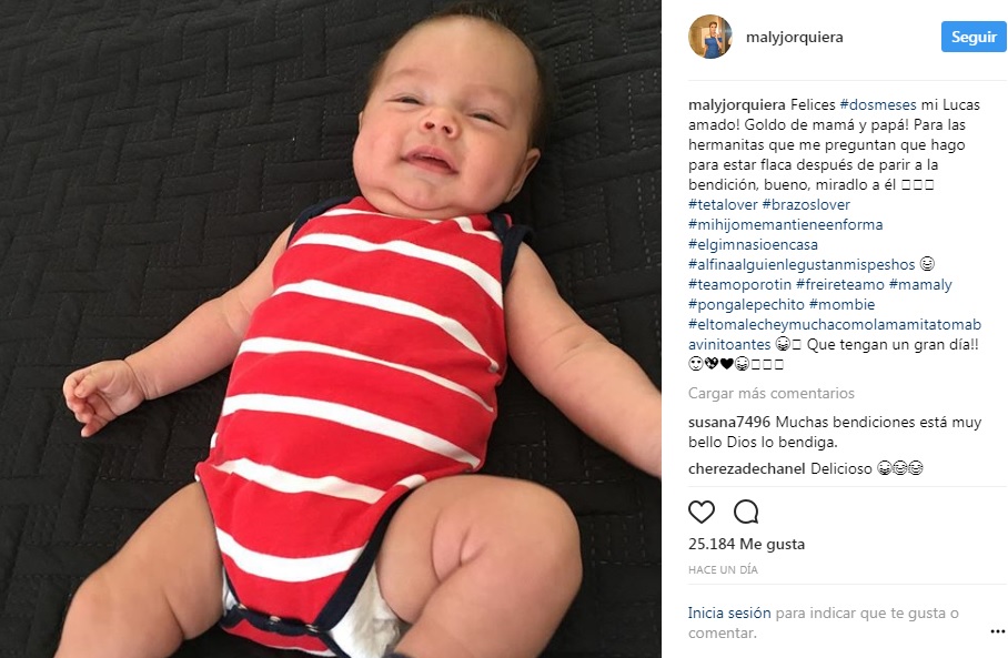 La imagen donde vemos al pequeño Lucas sobre la cama compartiendo una gran sonrisa, estaba acompañada de la divertida frase: "Felices #dosmeses mi Lucas amado! Goldo de mamá y papá! Para las hermanitas que me preguntan que hago para estar flaca después de parir a la bendición, bueno, miradlo a él".
