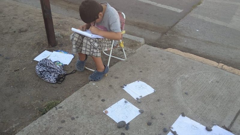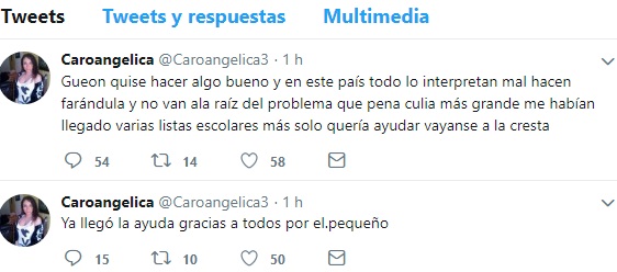 "Dedico este tuit a este pequeño que sentado afuera de la panadería vende sus dibujos para comprar sus útiles escolares .Chiquito mío te pido perdón por el país que te estamos heredando me mataste espero que mi grano de arena te sirva 😔😔😔😔😔😔😔", escribió esa vez.