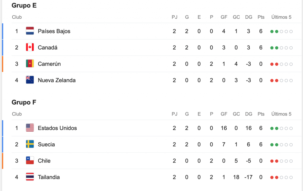 Sin embargo, hay un resultado que podría dejar sin pan ni pedazo a nuestra Roja femenina. En el grupo E, se enfrentan Camerún y Nueva Zelanda, quienes tampoco tienen punto, pero tienen mejor diferencia de goles que Chile (3 goles en contra cada equipo). Al enfretarse entre sí, podrían complicar el paso de nuestra selección a Octavos de Final.