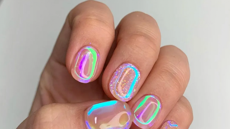 Esta manicura resulta especialmente fascinante gracias a su acabado reluciente y tornasoleado, cuyos matices cambian con el movimiento de los dedos y crean un efecto futurista.