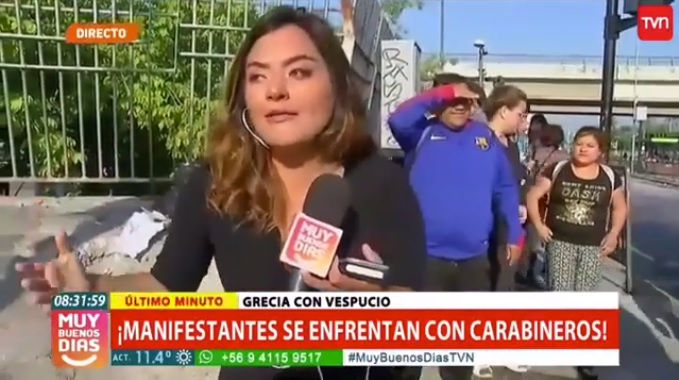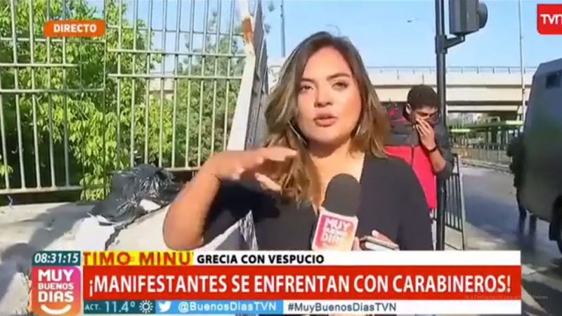 La periodista informaba sobre lo sucedido luego de que Carabineros hubiese lanzado bombas lacrimógenas en el lugar, cuando fue interrumpida por uno de los manifestantes.
