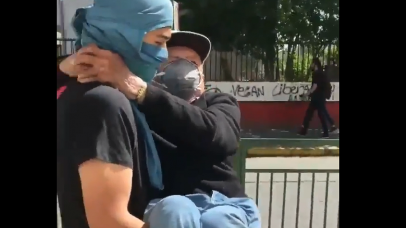 El registro, muestra a un joven encapuchado llevando a un adulto mayor en brazos, visiblemente afectado por las bombas lacrimógenas.