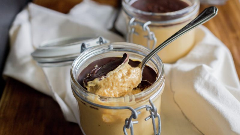 Luego, en una olla calentamos crema hasta el punto de hervor y ahí se le rocía chocolate picado, el cual debe quedar disuelto. Ahí, cuando sacamos los potes del refrigerador, echamos una ligera capa de este chocolate y volvemos a refrigerar para que la cobertura se endurezca.
