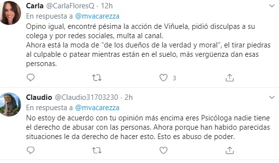 A través de Twitter, la ex panelista de 'Buenos días a todos' fue clara en decir que la actitud del animador de Mega fue errada. "No soy amiga de Viñuela y sólo me lo he topado a veces. Estuvo pésimo lo que hizo y eso todos lo sabemos, al igual que él que pidió disculpas", partió diciendo.