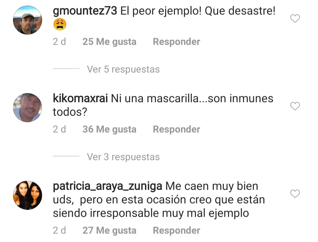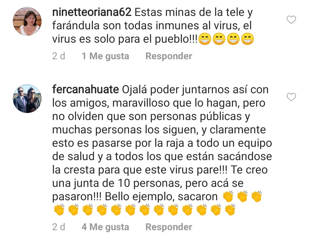 Como era de esperar, muchos de sus seguidores saltaron a increparla y le encararon que estaba siendo irresponsable, al ser ella y su marido, Rafael Araneda, figuras públicas en Chile.