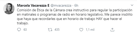 “Comisión de Ética de la Cámara crea instructivo para regular la participación en matinales o programas de radio en horario legislativo. Me parece insólito que haya que recordarles que en horario de trabajo HAY que hacer el trabajo“, escribió.
