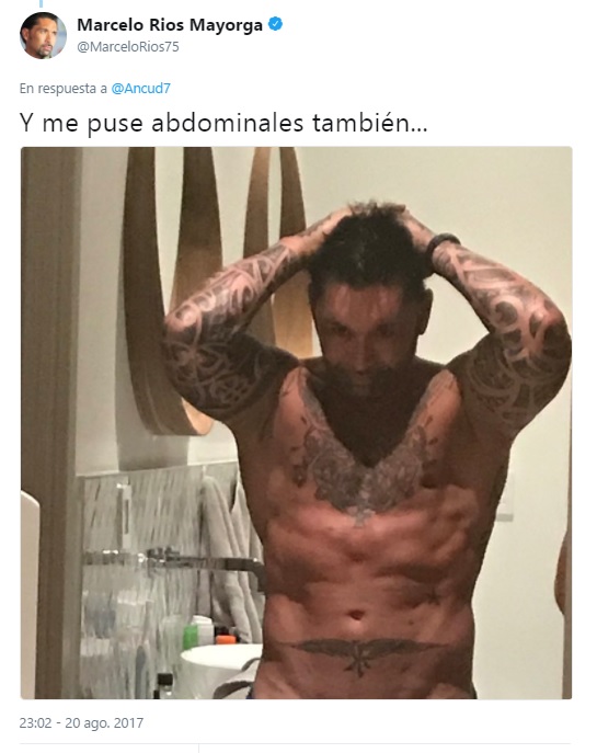 Consultado sobre si se había realizado algún tipo de cirugía plástica, el ex tenista respondió, en su estilo. "Y me puse abdominales también", tuiteó junto a una foto donde se le ve su trabajado abdomen. Los piropos le llovieron.
