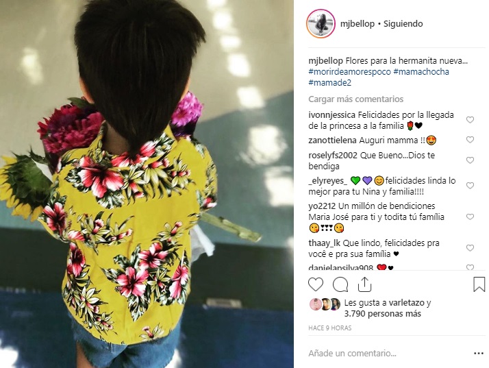 "Flores para la hermanita nueva...#morirdeamorespoco #mamachocha#mamade2", escribió la actriz para acompañar una foto de su hijo Tadeo, de 3 años.