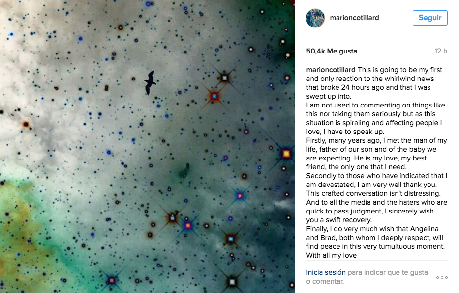 La encargada de dar vida a Édith Piaf en el cine y ganadora de un Oscar por esa misma cinta no se había referido al tema. Hasta ahora. Y es que la actriz escribió una declaración que compartió a través de su cuenta personal en Instagram, en la que asegura que esta será la primera y única vez que reaccione a esta noticia, y donde hecha por la borda los rumores al confirmar que está embarazada de su segundo hijo.