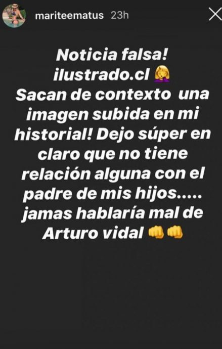 "¡Noticia falsa! ilustrado.cl Sacan de contexto una imagen subida de mi historial. Dejo súper en claro que no tiene relación alguna con el padre de mis hijos… Jamás hablaría mal de Arturo Vidal", sentenció.