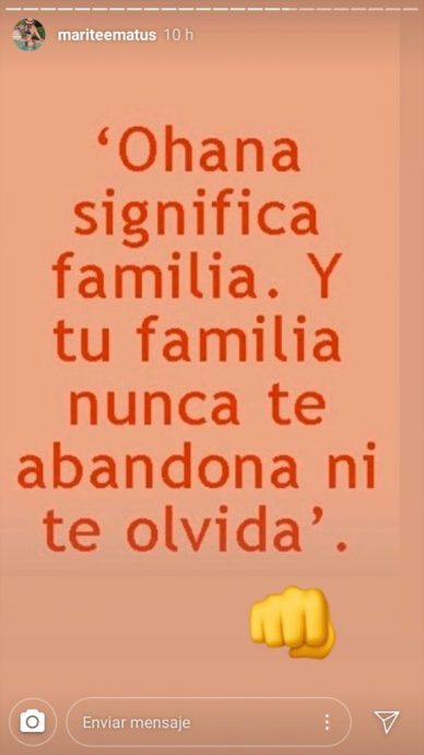 La polémica se generó luego de que Marité escribiera en sus historias de Instagram un mensaje que generó especulaciones. "Ohana significa familia. Y tu familia nunca te abandona ni te olvida", escribió la mujer.