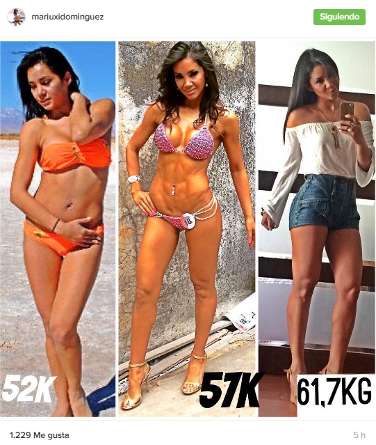 "En la primera foto estaba súuuper delgada, sin masa muscular pero altísima en % grasa. ¡Uuuf! en la segunda sin nada de líquido, seca a morir, con mucha más masa muscular, pesando más se me veía mas delgada y con % de 11-12, y a la actualidad pensando 10 kilos más que 8 años atrás. Me siento mejor con mi vestuario, con mi actitud, con mi entorno ,con mi vida y lo mejor que ahora tengo años que puedo mantenerlo así con mis hábitos saludables y actividad variada", añadió.