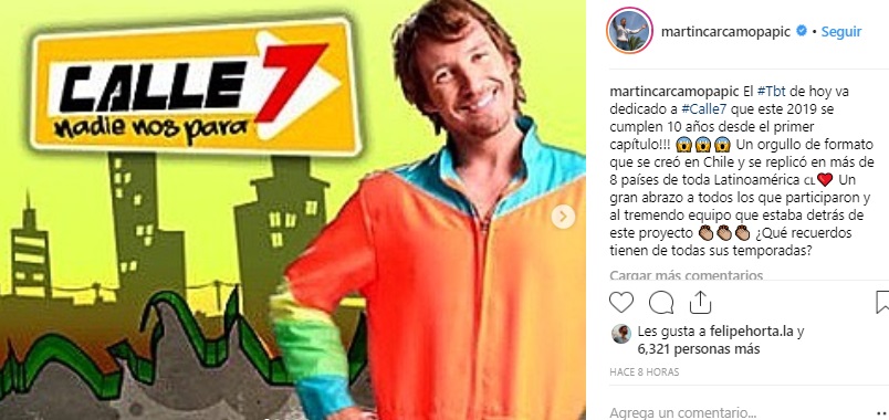 "El #Tbt de hoy va dedicado a #Calle7 que este 2019 se cumplen 10 años desde el primer capítulo!!! 😱😱😱 Un orgullo de formato que se creó en Chile y se replicó en más de 8 países de toda Latinoamérica 🇨🇱❤️ Un gran abrazo a todos los que participaron y al tremendo equipo que estaba detrás de este proyecto 👏🏼👏🏼👏🏼 ¿Qué recuerdos tienen de todas sus temporadas?", fue el mensaje del 'rubio natural'.