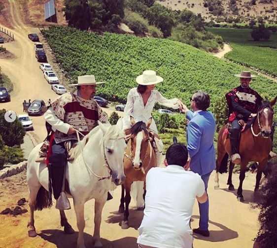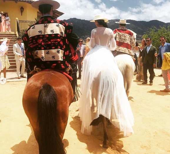La modelo llegó al lugar fiel a su estilo de huasa: montada a caballo, con un bello vestido con cola del diseñador Iván Pilkman, sombrero y botas blancas.