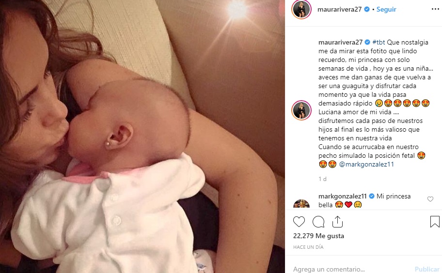 "Que nostalgia me da mirar esta fotito que lindo recuerdo, mi princesa con solo semanas de vida , hoy ya es una niña... a veces me dan ganas de que vuelva a ser una guaguita y disfrutar cada momento ya que la vida pasa demasiado rápido 😢😍😍😍😍😍 Luciana amor de mi vida .... disfrutemos cada paso de nuestros hijos al final es lo más valioso que tenemos en nuestra vida Cuando se acurrucaba en nuestro pecho simulado la posición fetal", escribió Maura.