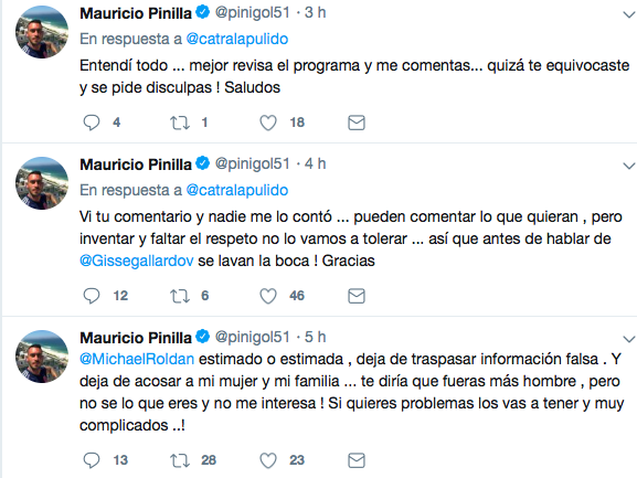 Asimismo, respondió a Catalina Pulido, quien habría llamado "Chusca" a Gisella, "Vi tu comentario y nadie me lo contó ... pueden comentar lo que quieran , pero inventar y faltar el respeto no lo vamos a tolerar ... así que antes de hablar de @Gissegallardov se lavan la boca ! Gracias", señaló Mauricio.
