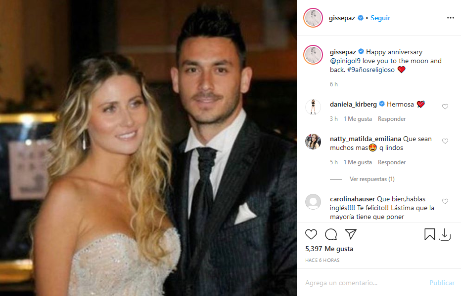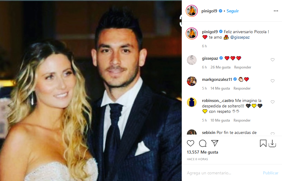 Ambos subieron la misma postal en sus cuentas de Instagram. Se trata de un recuerdo del día de su matrimonio. El futbolista escribió: "Feliz aniversario Piccola ! ❤️ te amo 👩❤️👨 @gissepaz".
