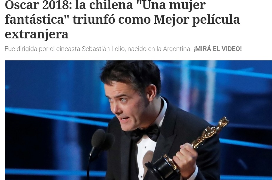 "El director argentino Sebastian Lelio se lleva el Oscar a la Mejor Película Extranjera por "Una Mujer Fantástica", titulaban algunos medios argentinos tras el triunfo de esta película nacional.