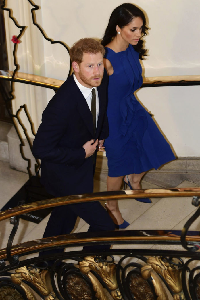 Markle llegó en compañía de Harry, y fue su look el que levantó las sospechas. La duquesa de Sussex lució un vestido azul eléctrico, sin mangas y que tenía una serie de pliegues en distintas zonas, sobre todo en la parte del vientre, y que le daba un extraño volumen a su figura.