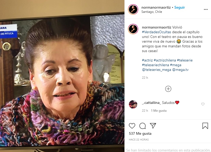 "¡Volvió Verdades ocultas desde el capítulo uno! Con el teatro en pausa es bueno verme viva de nuevo. ¡Gracias a los amigos que me mandan fotos desde sus casas!".