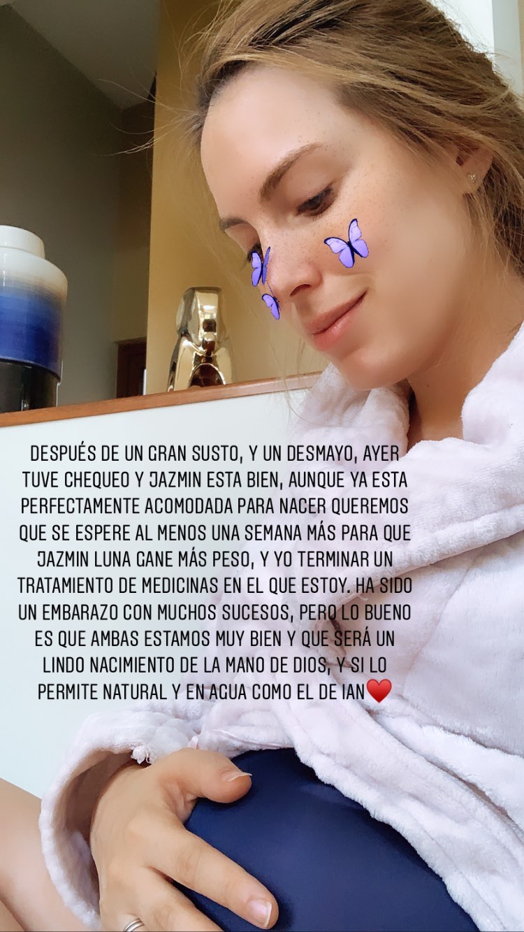 “Después de un gran susto, y un desmayo, ayer tuve chequeo y Jazmín está bien. Aunque ya está perfectamente acomodada para nacer. Queremos que se espere al menos una semana más para que Jazmín Luna gane más peso, y yo terminar un tratamiento de medicinas en el que estoy", partió contando.