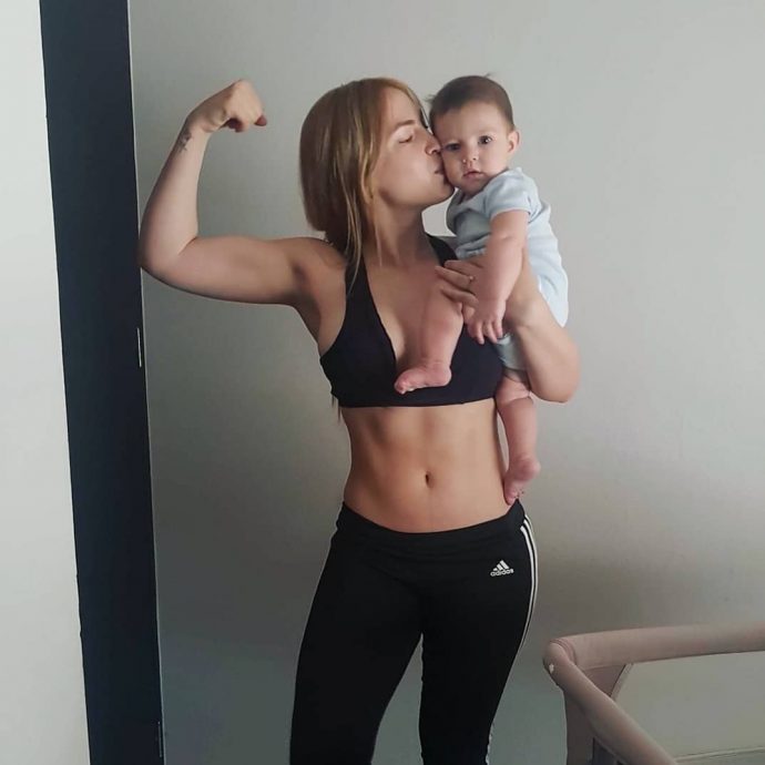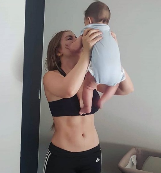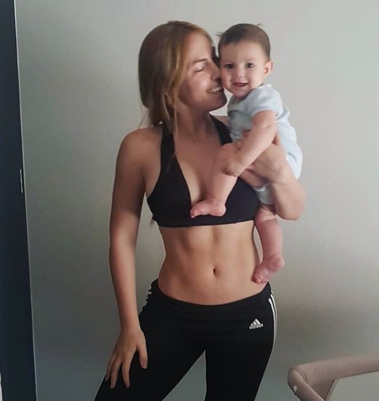 Las imágenes, muestran a Melina sosteniendo a su hijo, mientras muestra su abdomen y una marcada muscultura en los brazos.