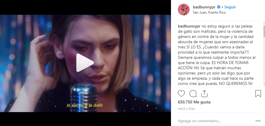 Uno de los que no quiso restarse a pronunciarse respecto a este tema fue el puertorriqueño del momento, Bad Bunny, quien sorprendió a todos con su último sencillo, "Solo de mi", que tiene una letra muy potente sobre cómo una mujer se cansa del maltrato de su pareja.