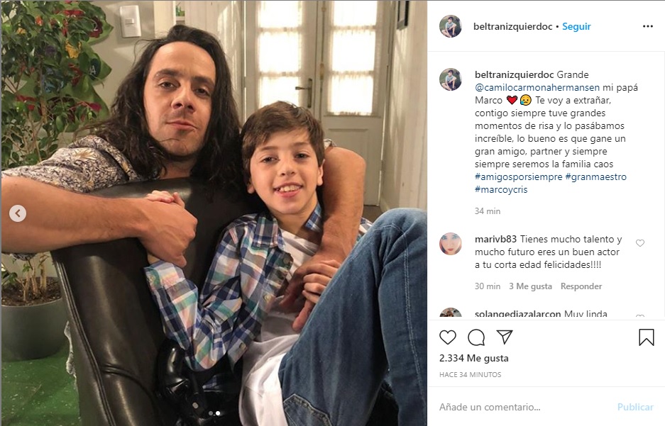 "Grande @camilocarmonahermansen mi papá Marco 💓😥 Te voy a extrañar, contigo siempre tuve grandes momentos de risa y lo pasábamos increíble, lo bueno es que gané un gran amigo, partner y siempre siempre seremos la familia caos", escribió Beltrán junto a los hashtags #amigosporsiempre #granmaestro #marcoycris.
