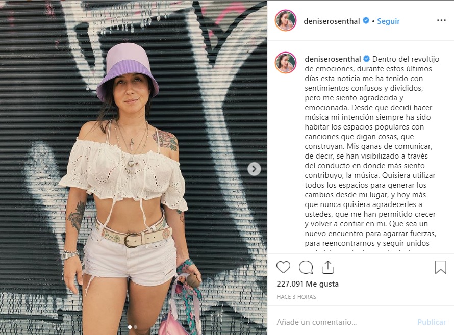 "Dentro del revoltijo de emociones, durante estos últimos días esta noticia me ha tenido con sentimientos confusos y divididos, pero me siento agradecida y emocionada. Desde que decidí hacer música, mi intención siempre ha sido habitar los espacios populares con canciones que digan cosas, que construyan. Mis ganas de comunicar, de decir, se han visibilizado a través del conducto en donde más siento contribuyo: la música", partió diciendo.
