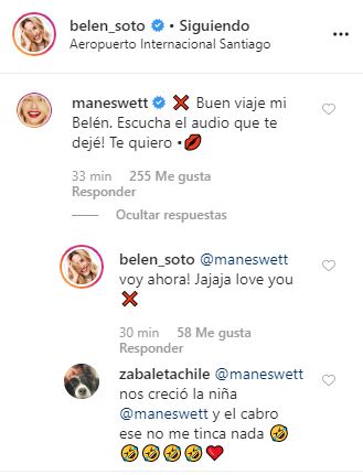 Una de las primeras en reaccionar a las fotos fue Mane Swett, su mamá ficticia, quien le dejó un mensaje típico de madre. "Buen viaje mi Belén. Escucha el audio que te dejé! Te quiero", le escribió la protagonista de "100 días para enamorarse".