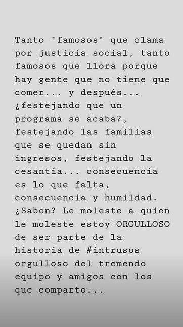 "Tanto 'famoso' que clama por justicia social (…) ¿festejando que un programa se acaba?, festejando las familias que se quedan sin ingresos, festejando la cesantía…", fueron parte de sus palabras. A la vez, el periodista recalcó que estaba orgulloso de haber formado parte del equipo de "Intrusos".