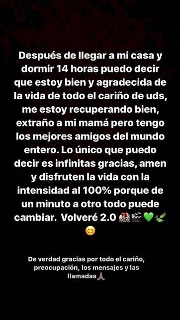 "Después de llegar a mi casa y dormir 14 horas puedo decir que estoy bien y agradecida de la vida, de todo el cariño de ustedes. Me estoy recuperando bien, extraño a mi mamá pero tengo los mejores amigos del mundo entero", partió contando la actriz.