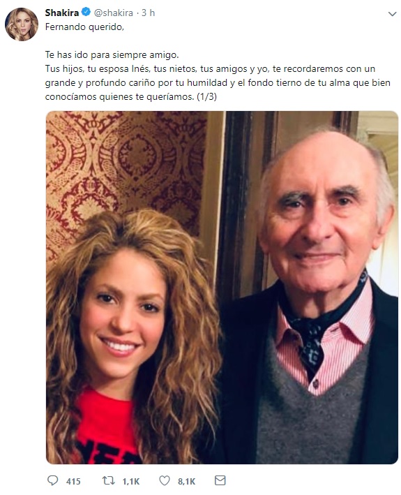 "Fernando querido, te has ido para siempre amigo. Tus hijos, tu esposa Inés, tus nietos, tus amigos y yo, te recordaremos con un grande y profundo cariño por tu humildad y el fondo tierno de tu alma que bien conocíamos quienes te queríamos", partió escribiendo la colombiana.