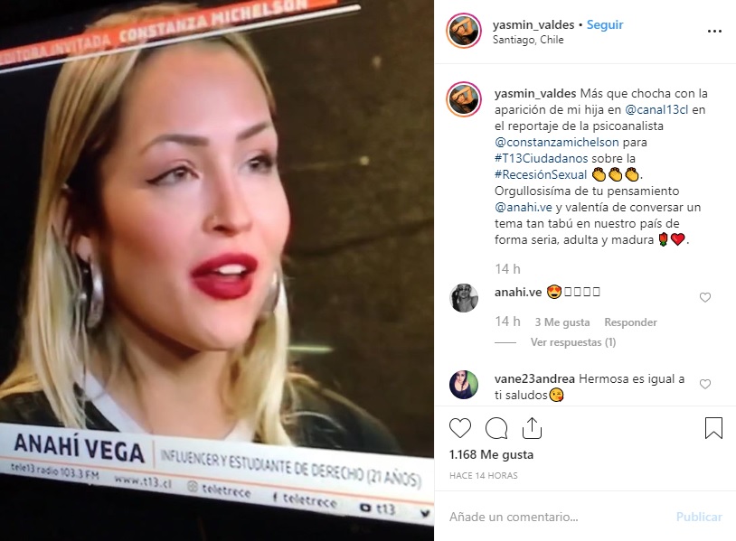 "Más que chocha con la aparición de mi hija en el reportaje de la psicoanalista Constanza Michelson para T13 Ciudadanos sobre la recesión sexual. Orgullosísima de tu pensamiento y valentía de conversar un tema tan tabú en nuestro país de forma seria, adulta y madura", escribió.