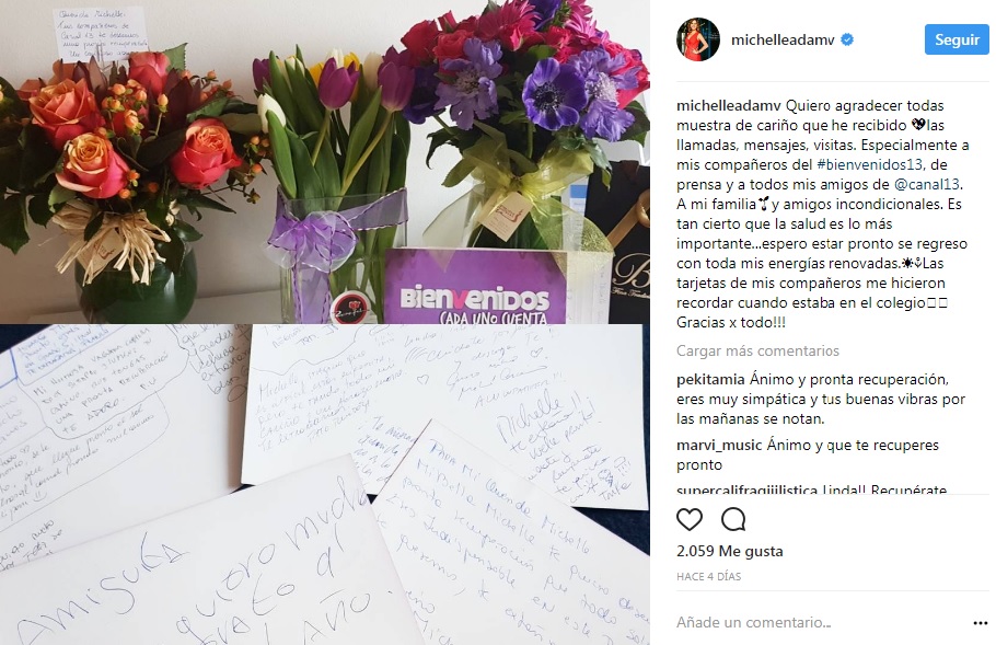 A través de sus redes sociales, Michelle agradeció la preocupación de sus seguidores y escribió un emotivo mensaje que decía: "Quiero agradecer todas muestra de cariño que he recibido, las llamadas, mensajes, visitas. Especialmente a mis compañeros del #bienvenidos13, de prensa y a todos mis amigos de @canal13. A mi familiay amigos incondicionales. Es tan cierto que la salud es lo más importante...espero estar pronto se regreso con toda mis energías renovadas. Las tarjetas de mis compañeros me hicieron recordar cuando estaba en el colegio. Gracias x todo!!!"