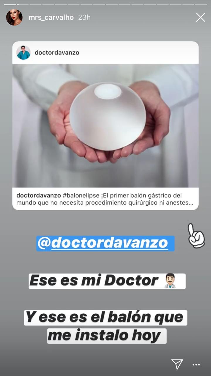 Así lo comunicó a través de sus historias de Instagram, contando que se sometió al procedimiento de manga gástrica. La exchica reality compartió un post promocionando al doctor que le instaló su balón gástrico.