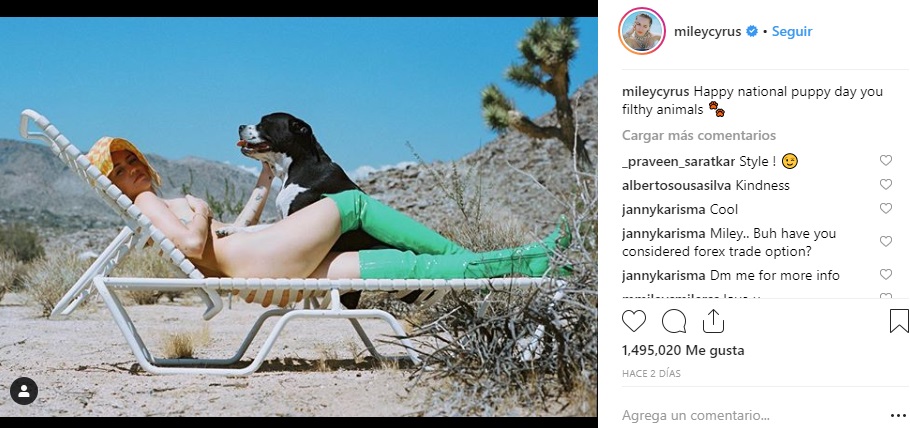 La cantante Miley Cyrus sigue siendo un fenómeno mundial, sobretodo en redes sociales, donde comparte sus pensamientos y distintos registros de su día a día, sobretodo en su Instagram donde tiene 89,2 millones de seguidores.
