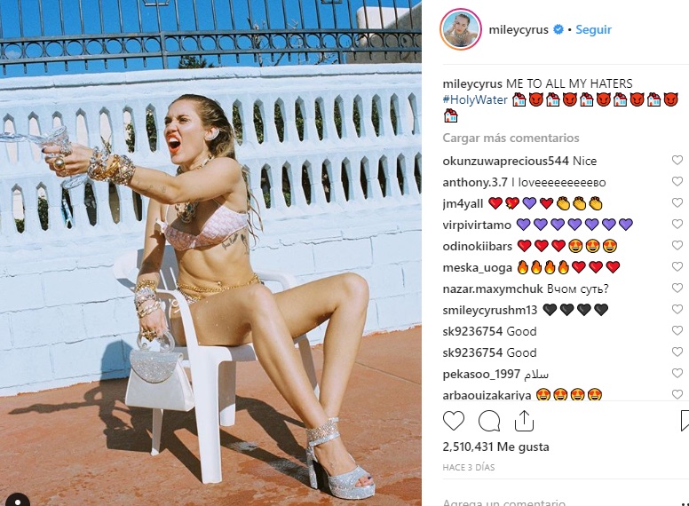 “De mí a todos mis ‘haters”, fue lo que escribió Miley en una postal donde aparece lanzando agua de un vaso, bien enojada, agregando un hashtag que lo complementaba: “Agua bendita".