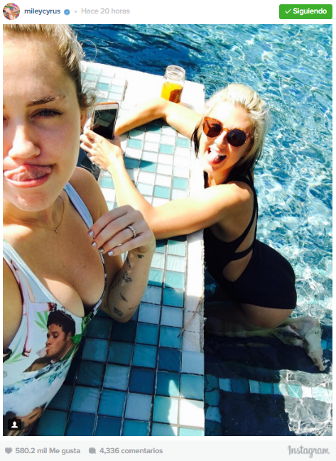La imagen fue compartida por la ex estrella Disney en su cuenta de Instagram. En ella se le ve tomándose una selfie con una amiga en la piscina, dejando ver su mano izquierda, con un brillante anillo en el dedo anular. Esto último habría motivado las especulaciones de la boda secreta con el guapetón Liam.