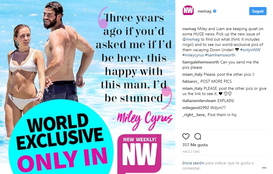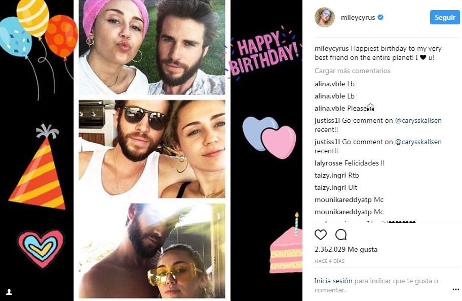 Por el momento, ninguno de los dos ha confirmado ni negado la noticia y a través de sus redes sociales Miley se dio el tiempo de celebrar el cumpleaños de Liam y publicó una serie de fotos del actor con la frase: "Feliz cumpleaños a mi mejor amigo en todo el mundo".