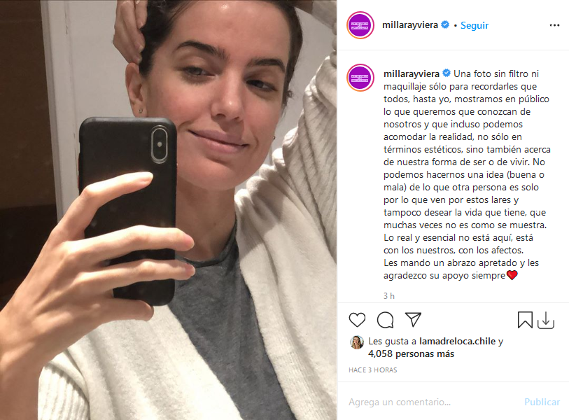 En este contexto, Millaray Viera utilizó su cuenta de Instagram para compartir una reflexión con sus seguidores, la cual acompañó con una fotografía sin filtros ni una gota de maquillaje.