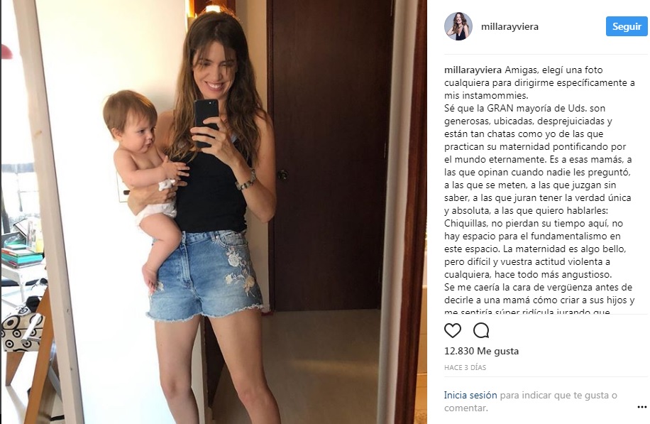 "Sé que la GRAN mayoría de Uds. son generosas, ubicadas, desprejuiciadas y están tan chatas como yo de las que practican su maternidad pontificando por el mundo eternamente", parte Millaray en la publicación donde aparece junto a su hija menor, Celeste.