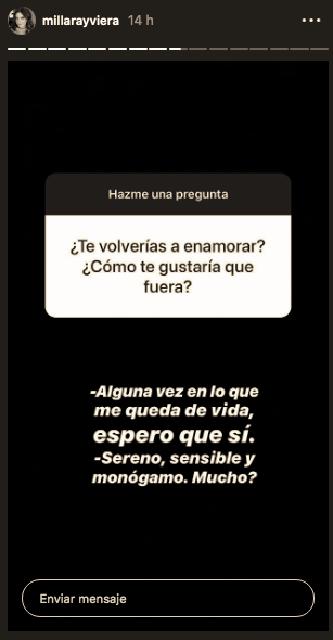 Ahora la conductora de "Yo soy" volvió a sincerarse con sus seguidores respecto al plano amoroso, esta vez a través de sus historias de Instagram. Ahí le preguntaron si se volvería a enamorar y cómo tendría que ser ese hombre. "Alguna vez en lo que me queda de vida espero que sí", respondió ella. Respecto a lo que busca en una pareja, mencionó que debe ser "sereno, sensible y monógamo".