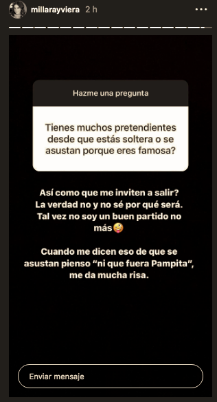 Además la preguntaron si tenía muchos pretendientes desde que estaba soltera, ante lo cual Millaray aseguró que no. "Así como que me inviten a salir? No y no sé por qué será. Tal vez no soy un buen partido nomás", reflexionó.