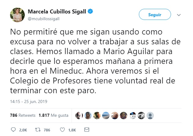 Así lo dio a conocer la autoridad a través de su cuenta de Twitter. "No permitiré que me sigan usando como excusa para no volver a trabajar a la sala de clases, y hemos llamado a Mario Aguilar para decirle que lo esperamos mañana, a primera hora en el Mineduc junto a su directiva", partió señalando.