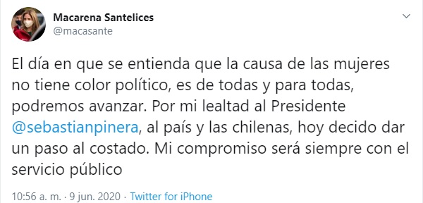 "El día en que se entienda que la causa de las mujeres no tiene color político, es de todas y para todas, podremos avanzar. Por mi lealtad al Presidente @sebastianpinera, al país y las chilenas, hoy decido dar un paso al costado. Mi compromiso será siempre con el servicio público", redactó.