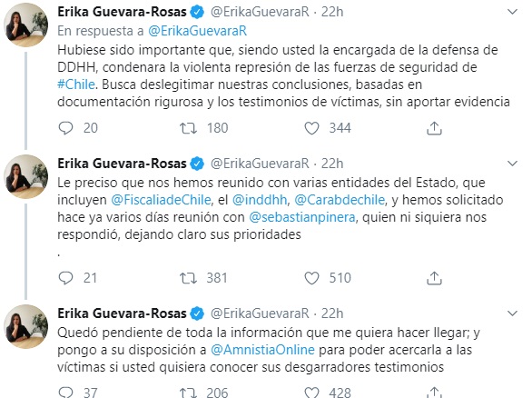 Tras la versión de Blumel y otras autoridades del Gobierno de que la organización no se habría contactado con ellos para complementar su reporte emitido esta semana sobre los casos de violaciones de Derechos Humanos en el país, la directora de las Américas de la organización, Erika Guevara, desmintió esto compartiendo un documento donde ellos solicitaron información y que fue timbrado por la recepción de La Moneda.