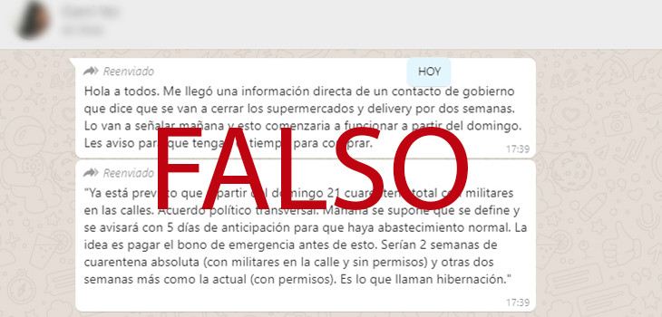 Este martes estuvo circulando una imagen a través de WhatsApp y otras redes sociales donde se aseguraba que a partir del domingo 21 de junio habría cuarentena total con militares en las calles, lo que se traduciría a una 'hibernación' en Santiago y gran parte de la Región Metropolitana.