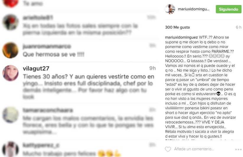 Mariuxi, al parecer, se molestó. Subió una imagen con un pantallazo del comentario y junto a ella, hizo sus descargos. "¿Ahora se supone que me dicen lo que debo o no ponerme, cómo vestirme, cómo mirar, cómo respirar, hasta cómo PARARME?? Hellooooo! ¿En serio? ¡Ay no! ¡Qué lataaaa! De verdad. Vamos así nomás, el que puede, puede y el que no, ¡no me siga y listo! Lo he dicho mil veces", escribió.