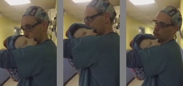 Dennis Moses, asistente quirúrgico del Centro BARCS, en Estados Unidos, tomó entre entre sus brazos al animal y comenzó a darle besos en reiteradas ocasiones para consolarlo en su dolor, producto de la intervención a la que había sido sometido. Por su parte, Meesha se dejó consolar tranquilamente.